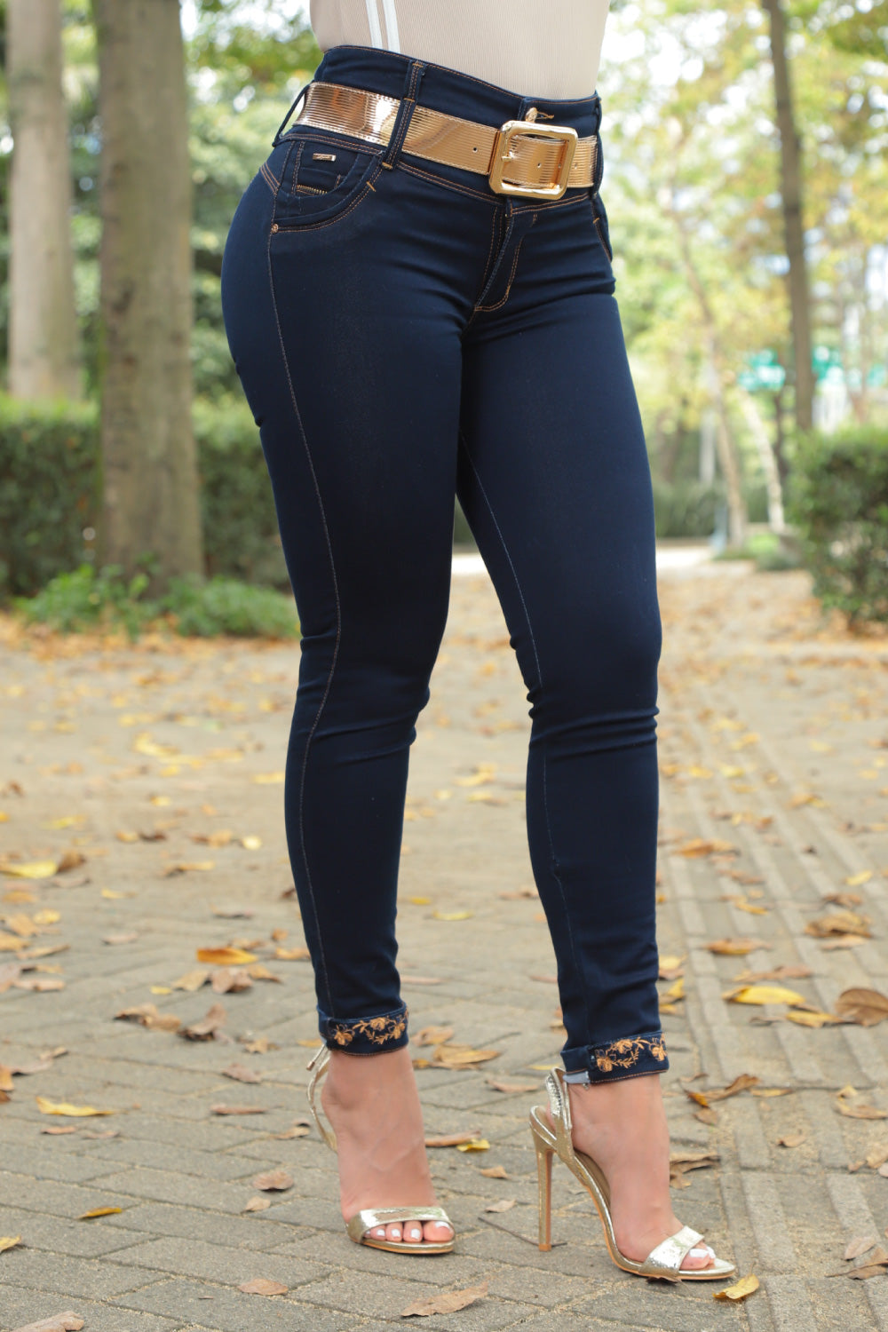 Jean push up de tiro alto con efecto moldeador en abdomen, realce de glúteos y ajuste slim para alargar visualmente las piernas.