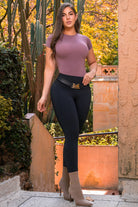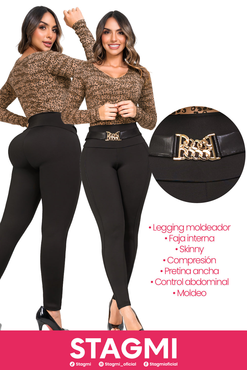 LEGGIN SKINNY CON EFECTO CUERO Y CORREA – Legging moldeador skinny con faja interna + detalles en efecto cuero SMI1391