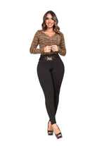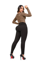 Diseño tipo skinny con acabado en bies de efecto cuero, correa decorativa y pretina anatómica. Diseñado para moldear desde el abdomen hasta los tobillos, adaptándose al cuerpo femenino con naturalidad.
